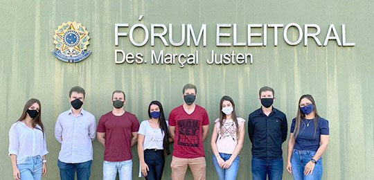 Fotografia de um grupo de pessoas em frente ao Fórum Eleitoral Des. Marçal Justen