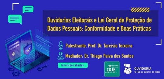 A Ouvidoria do Tribunal Superior Eleitoral (TSE) convida magistrados, servidores e colaboradores da Justiça Eleitoral para participar do encontro "Ouvidorias Eleitorais e Lei Geral de Proteção de Dados Pessoais: conformidade e boas práticas". O evento virtual, que acontece no dia 5 de agosto, às 17h, será mediado pelo juiz membro da Corte e ouvidor do Tribunal Regional Eleitoral do Paraná (TRE-PR), Dr. Thiago Paiva dos Santos, e terá a palestra do professor especializado em Direito Digital Tarcisio Teixeira.