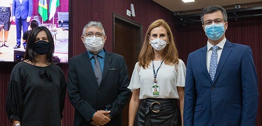 Na foto: o presidente do TRE-PR, desembargador Coimbra de Moura, e o juiz ouvidor, Dr. Thiago Paiva dos Santos (à direita) com as servidoras da recém-criada Ouvidoria da Mulher, Mariana Cordeiro (à dir.) e Melissa Medroni