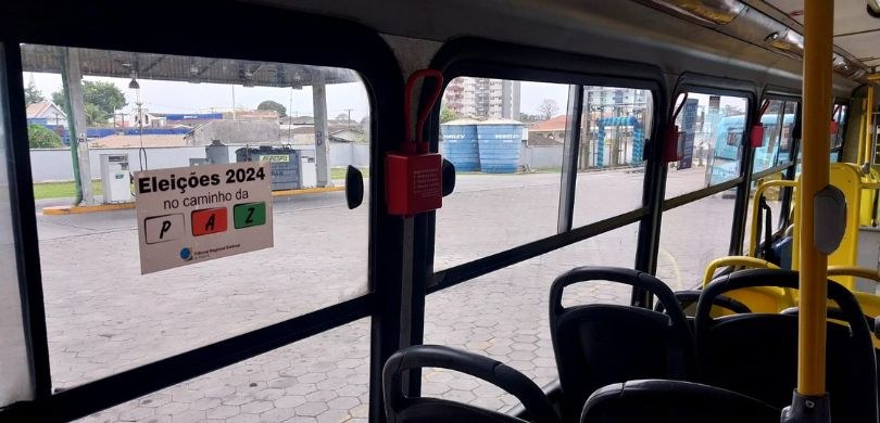 A empresa Viação Rocio afixou adesivos no interior dos ônibus que realizam o transporte público no município de Paranaguá para auxiliar na divulgação da campanha “Eleições no Caminho da Paz”. A instituição é signatária do Pacto do Tribunal Regional Eleitoral do Paraná (TRE-PR) que tem como propósito contribuir para a pacificação do processo eleitoral no estado.