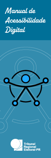 Banner vertical em tons de azul com o título "Manual de Acessibilidade Digital" em letras brancas na parte superior. No centro, um ícone estilizado em preto e azul que representa uma figura humana com braços e pernas estendidos, cercada por linhas que sugerem conexão ou um círculo. Na parte inferior, o logo do "Tribunal Regional Eleitoral-PR" em branco.