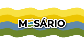Banner em fundo branco, em que se lê "Mesário", em letras pretas. Ao fundo, observam-se ondas coloridas nas cores amarela, laranja, azul e verde.