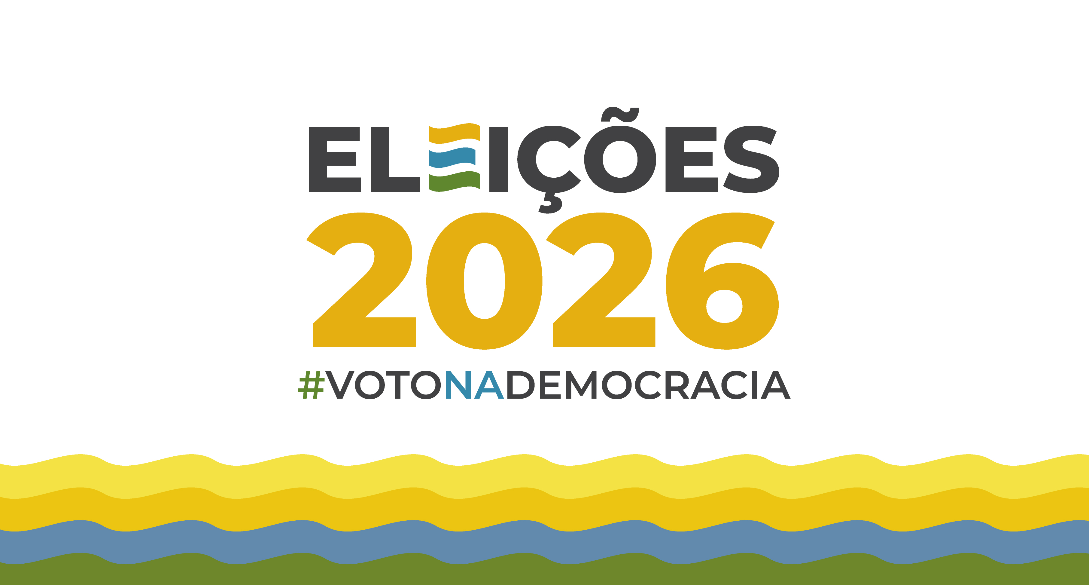 Banner em fundo branco, em que se lê, em letras pretas, verdes, azuis e amarelas, "Eleições 2026 - #Votonademocracia". Abaixo, obsrvam-se ondas nas cores verde, azul, amarela e laranja.