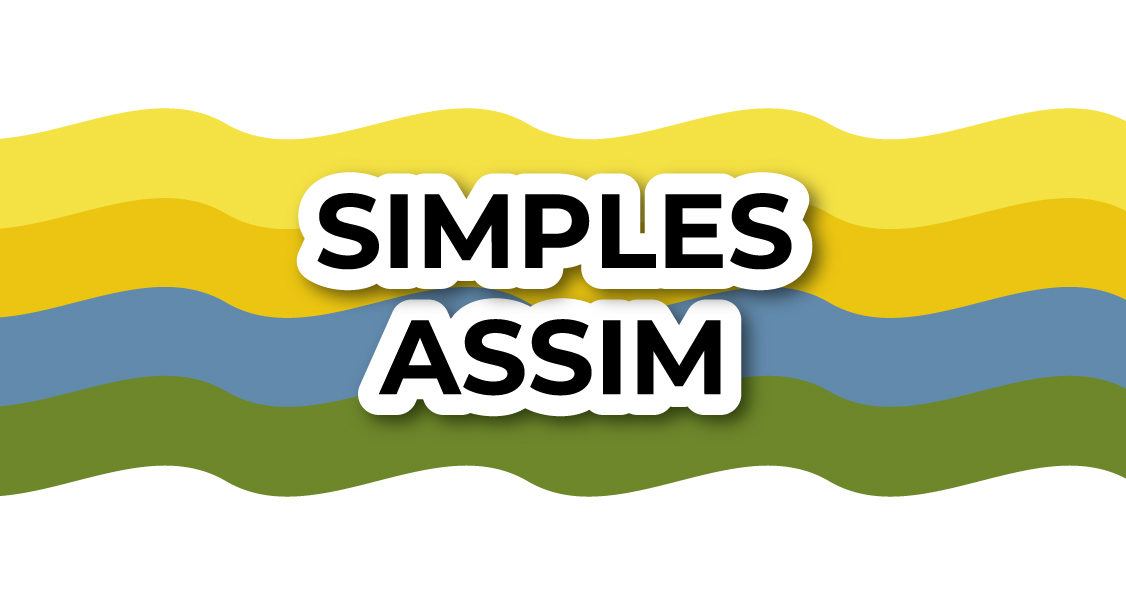 Banner em fundo branco, em que se lê "Simples Assim", em letras pretas. Ao fundo, observam-se ondas coloridas nas cores amarela, laranja, azul e verde.