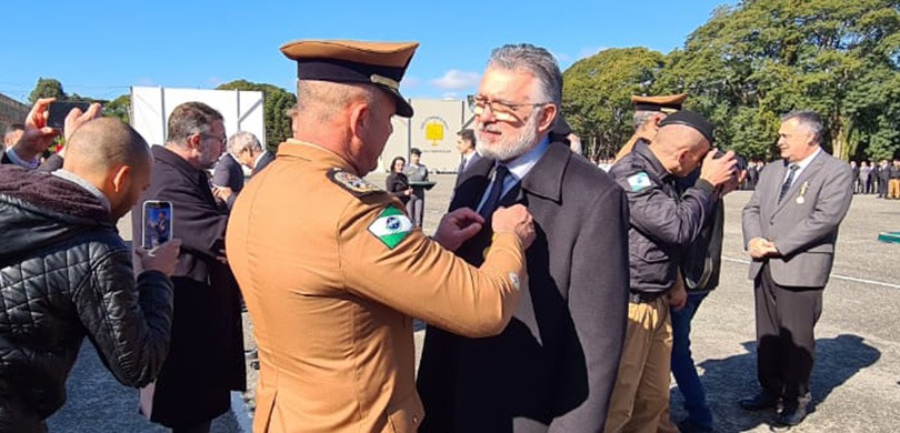 A entrega da honraria aconteceu na Academia da Polícia Militar do Guatupê pelo comandante-geral da PMPR, coronel Hudson Leôncio Teixeira, e pelo secretário de Estado de Segurança Pública, doutor Wagner Mesquita.