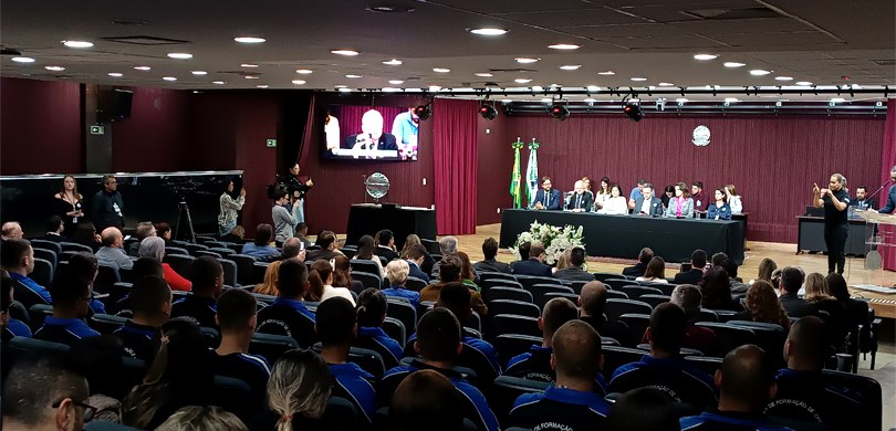 Compuseram a mesa de autoridades a juíza da 2ª ZE e presidente da CAVE, doutora Mychelle Pacheco Cintra Stadler; o presidente do TRE-PR, desembargador Sigurd Roberto Bengtsson; o vice-presidente do TRE-PR, desembargador Luiz Osório Moraes Panza; o promotor da 2ª ZE, doutor Rodrigo Leite Ferreira Cabral; a presidente da Ordem dos Advogados do Brasil - Seção Paraná (OAB-PR), doutora Marilena Indira Winter; e a diretora-geral do TRE-PR, Solange Maria Vieira.