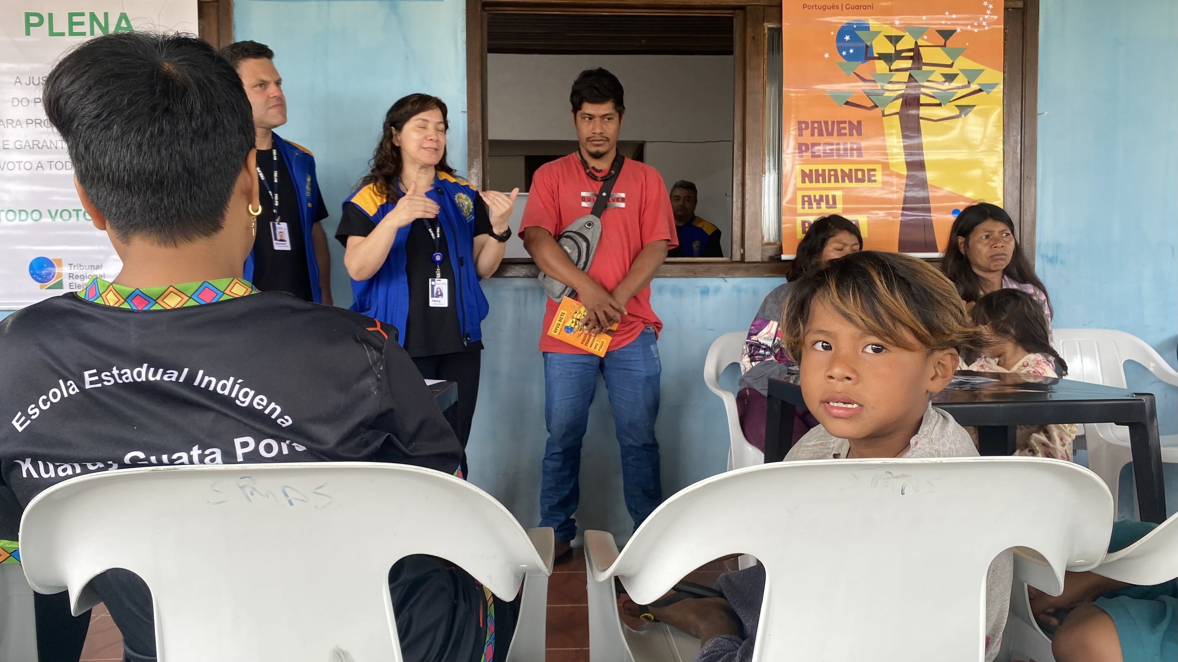 Em uma sala, um grupo de pessoas está reunido para uma apresentação ou discussão. Uma mulher de colete azul e um homem de camisa vermelha estão de pé na frente, falando para um público sentado, onde uma criança olha diretamente para a câmera. Ao fundo, um cartaz com texto em português e guarani está pendurado na parede.