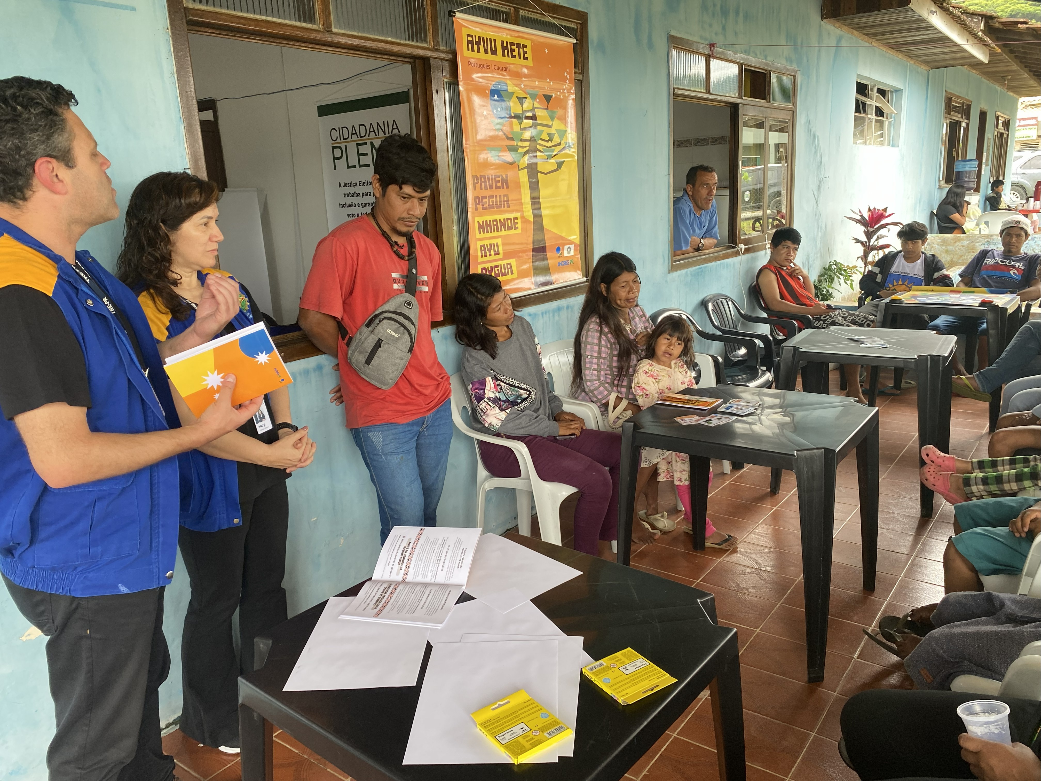 Em um ambiente coberto com paredes azuis, membros de uma equipe de atendimento, dois de coletes azuis e um de camisa vermelha, interagem com um grupo sentado à direita, composto por mulheres, crianças e homens; sobre uma mesa, há papéis espalhados e caixas amarelas, com cartazes sobre "Cidadania Plena" e "Apy'u Hete" visíveis nas janelas ao fundo.
