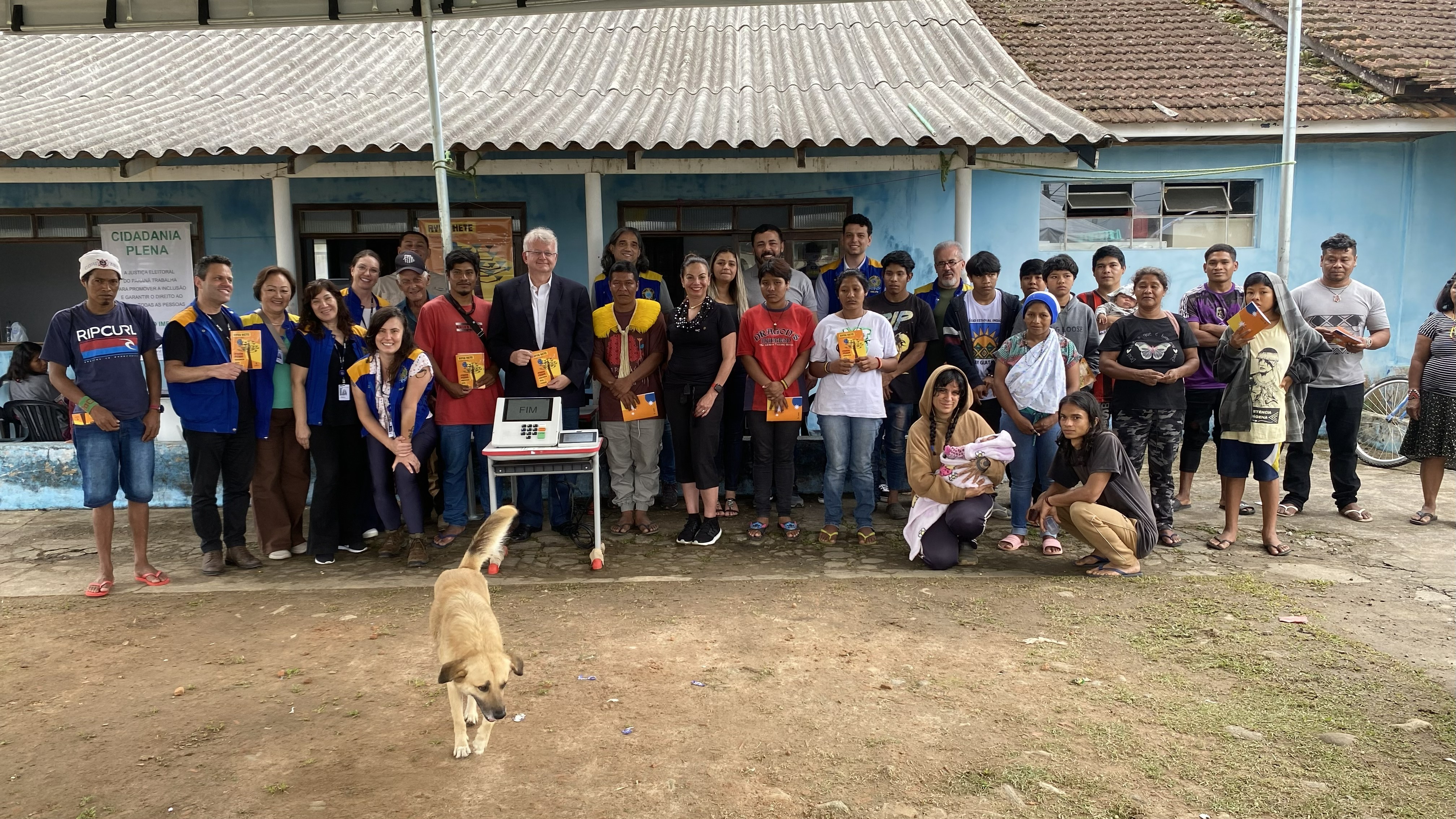 Um grupo grande e diversificado de pessoas, incluindo membros da comunidade e organizadores de coletes azuis, está posando para uma foto em frente a um prédio azul, com alguns segurando panfletos e uma urna eletrônica no centro; a foto é tirada ao ar livre, com um cachorro caminhando sobre o chão de terra.