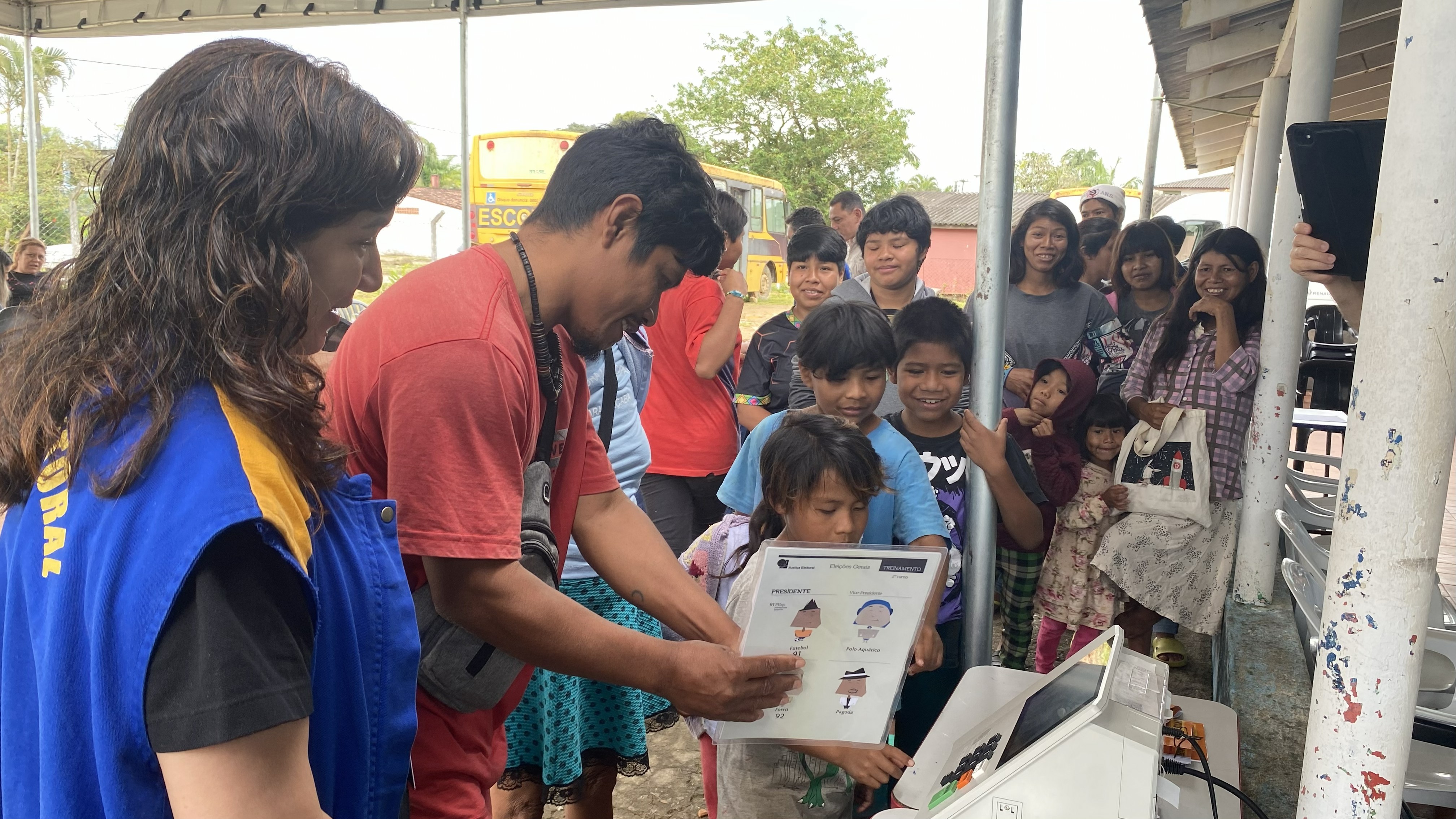 Duas pessoas adultas, uma mulher de colete azul e um homem de camisa vermelha, interagem com um grupo de crianças e jovens em um ambiente externo, provavelmente ensinando sobre votação; o homem aponta para um folheto informativo com ilustrações ao lado de uma urna eletrônica, enquanto o grupo os observa.