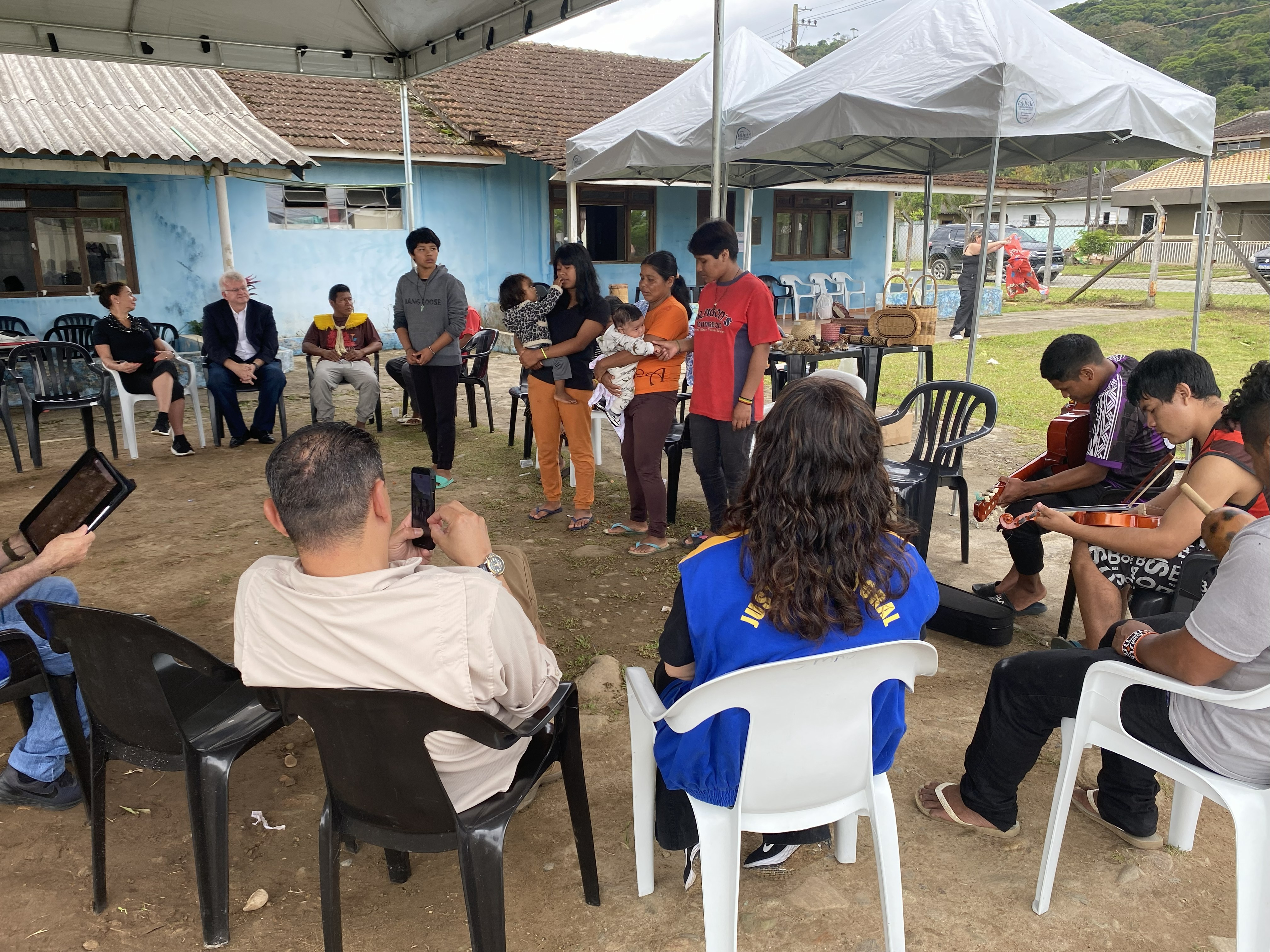 Um grupo diversificado de pessoas está reunido sob uma tenda branca em um ambiente externo, com casas de estrutura simples ao fundo; enquanto um homem sentado toca violão e outro violino à direita, na área central, pessoas em pé e sentadas interagem, incluindo mulheres com crianças e adultos sentados observando.