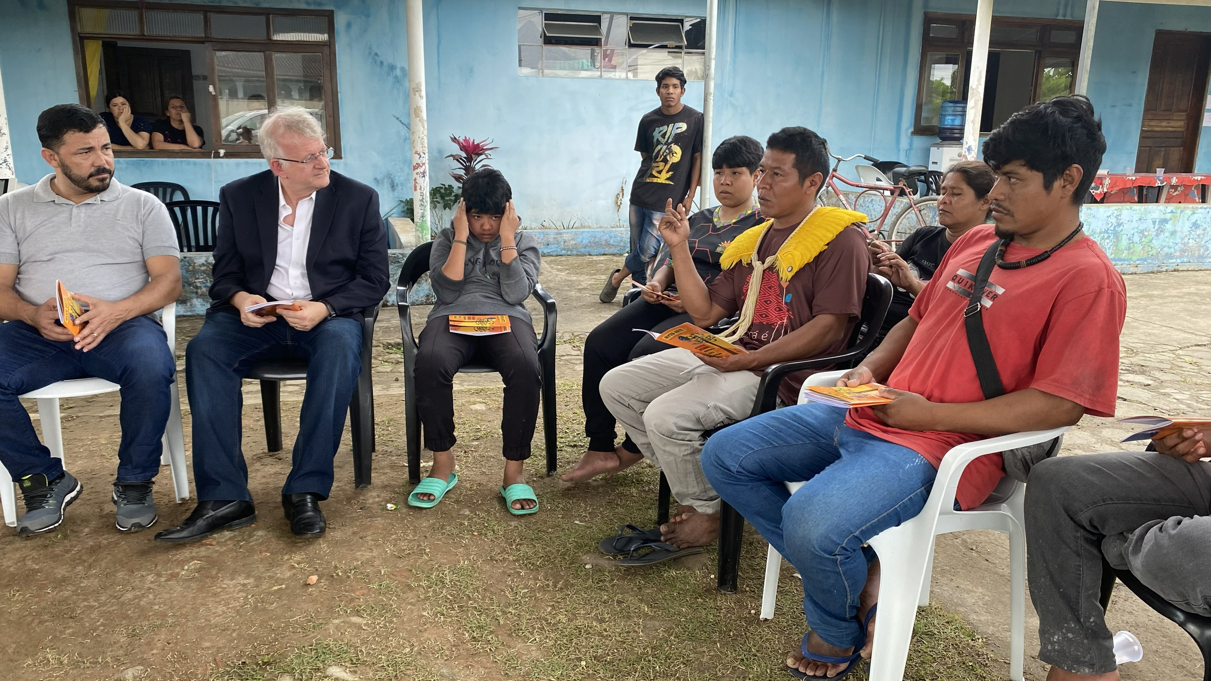 Um grupo de pessoas está sentado em cadeiras de plástico ao ar livre, em frente a um prédio de cor azul, participando de uma reunião; um homem indígena com um colete salva-vidas amarelo fala gesticulando com a mão, enquanto os outros, incluindo um homem de terno e outro de camisa vermelha, ouvem, todos segurando panfletos laranja.